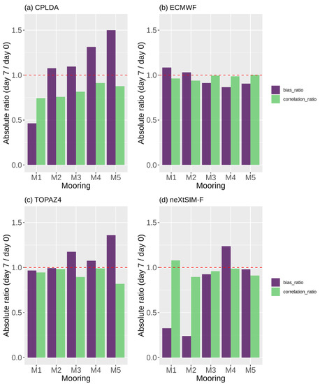 Plots displaying the bias and correlation ratios of day seven to day zero model fields for: (a) CPLDA; (b) ECMWF; (c) TOPAZ4; (d) neXtSIM-F.