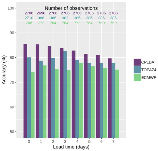 Generally, the CPLDA model displays a slight decrease in accuracy from 85% to 80% as the lead time is increased to seven days. The TOPAZ4 and ECWMF models have accuracies of 77–83% and 74–78%, respectively, and for both systems, the accuracy does not have an obvious dependency on lead time.
