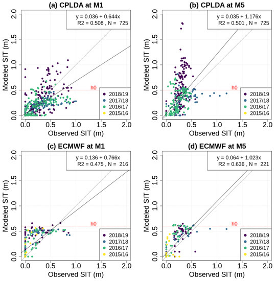 Scatter plots comparing daily analysis and observation SIT for the following: (a) CPLDA at M1; (b) CPLDA at M5; (c) ECMWF at M1; (d) ECMWF at M5. The line x = y (dashed) is depicted as well as the model regression line (solid) and the value for the model tuning parameter h0 (red, dashed).