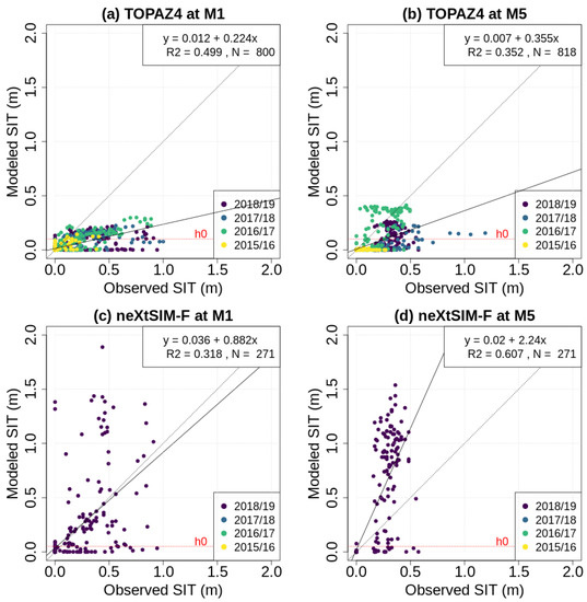 Scatter plots comparing daily analysis and observation SIT for the following: (a) TOPAZ4 at M1; (b) TOPAZ4 at M5; (c) neXtSIM-F at M1; (d) neXtSIM-F at M5.
