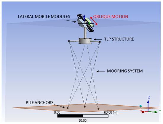In addition, CECO offers high flexibility in terms of installation. For nearshore locations (<30 m of water depth), the original CECO design was based on a fixed-bottom support structure (monopile, tripod or jacket foundations). However, for deeper locations, the use of a fixed support structure becomes economically unfeasible; therefore, a floating support structure is required. In this context, the floating version of CECO was designed and optimised for the wave conditions of the Portuguese coast, using an operational-limit sea state of 7.5 m and 16 s, with a configuration based on a tension leg platform with a star-shape mooring system offering the best results in terms of energy production and mooring loads (Figure 2) [56]. For the present work, the floating version of CECO defined by Giannini et al. [56] was used as case study. The main design characteristics of the device are summarised in Table 1, while its (absorption) power matrix is shown in Figure 3.