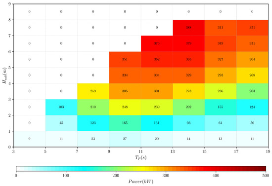 On the other hand, the SIMAR hourly records of wave data (spanning from 1 January 1960 to 31 December 2020) were used to assess the wave energy resource in the area of study. For this purpose, the omni-directional wave energy matrix (Figure 7) was constructed in terms of significant wave height (), peak period () and annual number of hours of occurrence (). In general, the most recurrent sea states are concentrated in the range of 1–3 m of and 9–13 s of . However, the bulk of wave energy shifts towards the region of 2–5 m of and 9–15 s of , with some sea states exceeding values of 20 MWhm. On these grounds, the annual energy production of the wave farm was computed by combining the CECO and wave resource matrices as indicated in Equations (8) and (9). Therefore, the annual energy output of the wave farm resulted as 13.52 GWh/a.