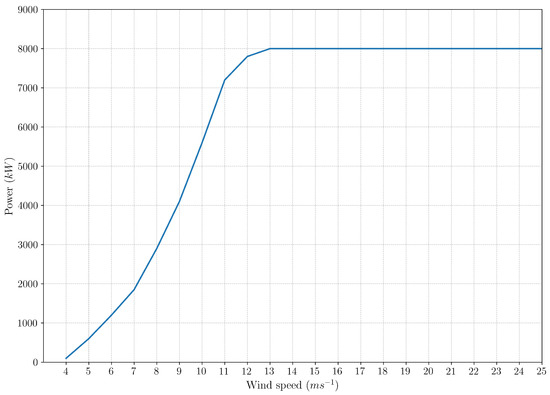 Based on Figure 4, the power curve of the Vestas V164-8.0 MW turbine can be expressed analytically as follows: