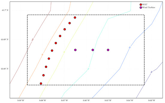 Spatial distribution of the proposed co-located wave-wind farm. (Colour lines represent the bathymetric isolines. Red and magenta dots highlight the position of WECs and wind turbines, respectively. Black dashed line represents the allocated sea space for the WindFloat Atlantic farm).
