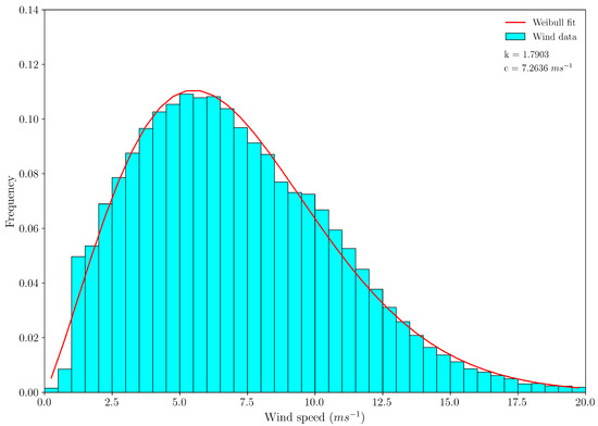 Observed wind data (histogram) and Weibull probability density function (red line) for the annual scenario (k and c are the annual scale and shape parameter values of the Weibull distribution).