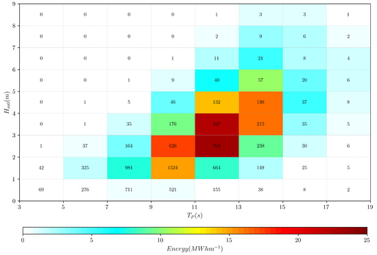 Wave resource energy matrix. (Colourmap represents the annual energy per meter of wave front and the numbers represent the occurrence in annual hours for each sea state ()).
