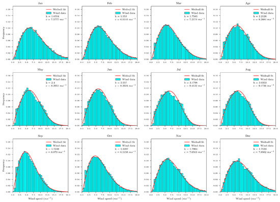 Observed wind data (histogram) and Weibull probability density function (red line) for the monthly scenario (k and c are the monthly scale and shape parameter values of the Weibull distribution).