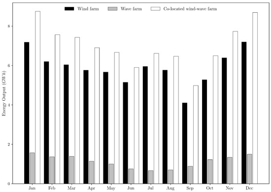 The energy output produced by the wind, wave and co-located farms was computed on annual (Section 3.1.1) and monthly (Section 3.1.2) bases, using the methodology presented in Section 2.3.1.