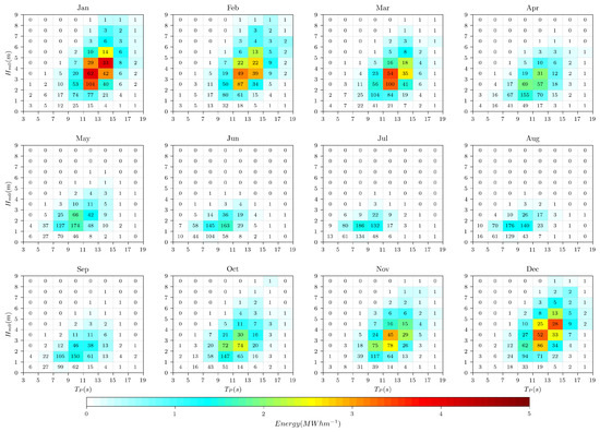 For the case of the wave farm, the SIMAR wave records were used to characterise the wave resource on a monthly basis. Therefore, the omni-directional monthly wave energy matrices were constructed and plotted in Figure 10. Overall, the wave energy resource presents a strong seasonal variability. For the winter months (January, February, March and December), the bulk of wave energy is concentrated in the range of 2–5 m of and 9–15 s of , with some sea states exceeding monthly energy values of 4 MWhm. Conversely, for the summer months (from June to August), the wave energy resource is significantly lower, with a very limited number of sea states exceeding 1 MWhm, which is mainly concentrated in the range of 1–3 m of and 5–13 s of . Again, combining the CECO and wave resource matrices (Equations (8) and (9)), the monthly energy output of the wave farm was computed and plotted in Figure 9. As expected, energy production presents a strong intra-annual variability, ranging from 1.57 GWh in January to 0.67 GWh in July.