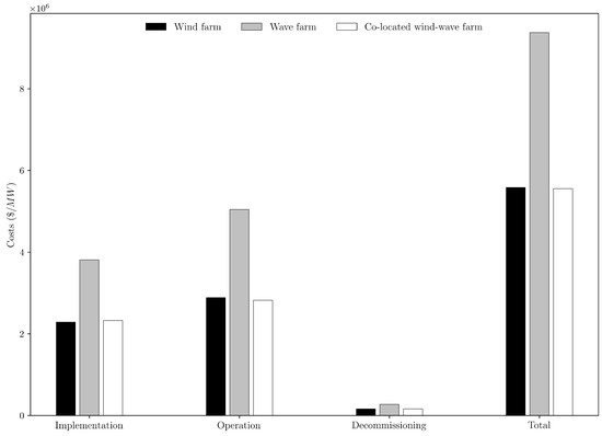 With the aim of assessing the potential cost benefits of the co-located wind–wave farm proposed in Section 2.2.2 (Figure 5), the LCoE was computed and compared for three different scenarios, the stand-alone wind farm (WindFloat Atlantic), the stand-alone wave farm (CECO array) and the co-located wind–wave farm. For this purpose, the analytical cost model proposed by Clark et al. [30], which was developed ad hoc for co-located floating wind–wave farms, was used. The model computes the LCoE using a life-cycle cost approach [30].