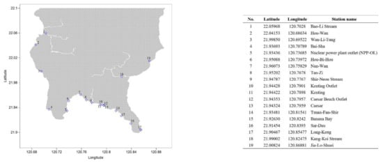 The KNP LTER sample sites are shown in Figure 1, and seawater quality was assessed at regular intervals between 2001 and 2019. The following parameters were assessed as in our prior works [3,4]. Practically, quality control (QC) for sampling equipment and field measurement procedures, including those for temperature, salinity, pH, and dissolved oxygen (DO), were conducted in situ following government QA/QC regulations. The remaining water samples were preserved at 4 °C and returned to the laboratory for analysis of the following parameters: pH, five days of biochemical oxygen demand (BOD5), nutrients (nitrite, nitrate and phosphate, ammonia) chlorophyll-a, suspended solids, and turbidity.