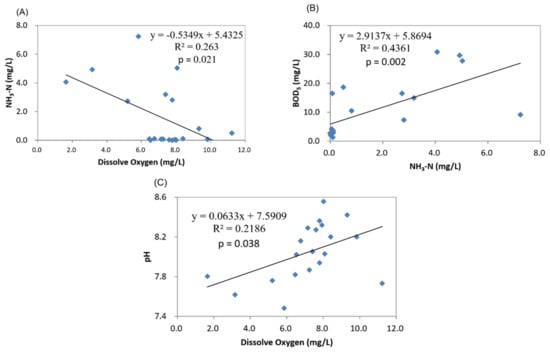 Correlations among selected seawater quality parameters across sites. Correlation plots are shown between NH3-N and dissolve oxygen (A), BOD5 and NH3-N (B), and pH and dissolve oxygen (C).