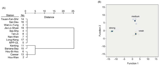 CA was also used to assess similarity across sampling sites, and three clusters were identified (Figure 3A); these clusters were supported by a discriminant analysis (i.e., CCA; Figure 3B and Table 5). Based on the data, the three clusters appear to be linked to anthropogenic impact. The “weak” group (Figure 3B), which featured high salinity and low nutrient levels consisted of Wan-Li-Tung, Bai-Sha, nuclear power plant outlet (NPP-OL), Nan-Wan, Tan-Zi, Tsuan-Fan-Shir, Sar-Dau, and Long-Keng. The “strong” group was characterized by low salinity and high nutrient levels and included Kenting and Banana Bay. The remaining sites fell within the “medium” group (Hou-Wan, Hou-Bi-Hu, Caesar, and others). Thirteen of the fourteen groups were classified correctly by the corresponding model (Table 6); Banana Bay was incorrectly classified, possibly due to its low salinity. In summary, then, we documented higher anthropogenic nutrient input in the summer rainy season, and study sites clustered by degree of nutrient loading. Those sites near major freshwater discharge areas were particularly affected by high nutrient loads.
