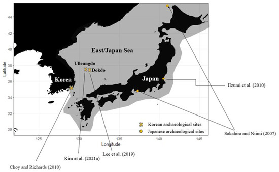 The possible historical distribution range from Melin et al. [5] (grey color) and archaeological sites of the Zalophus japonicus in the East/Japan Sea from [3,4,6,7,8].