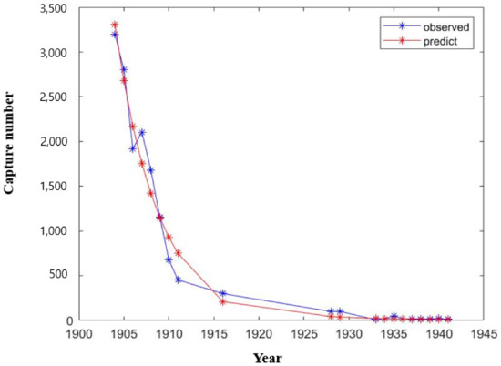 The comparison between observed and estimated annual capture numbers of the Dokdo sea lion.