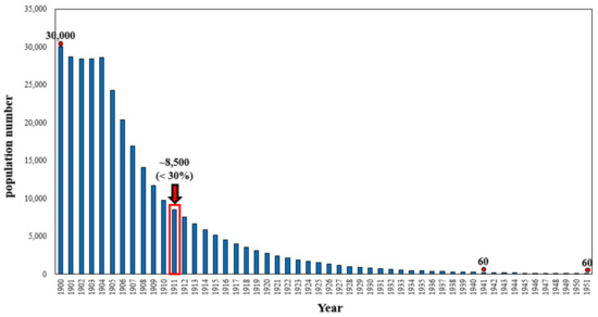 At the current stage, limited quantitative data on the Dokdo sea lion and their capture numbers by Japanese fisherman are available. The reported populations of the Dokdo sea lion in 1900, 1941, and 1951 and the annual capture numbers from 1904 to 1941 were obtained from the historical records and unpublished documents from Korea and Japan ([2,13,14,18]; Figure 1).