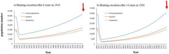 The population recovery scenarios for the Dokdo sea lion. (a) hunting cessation after 6 years in 1910, (b) hunting cessation after 14 years in 1920.