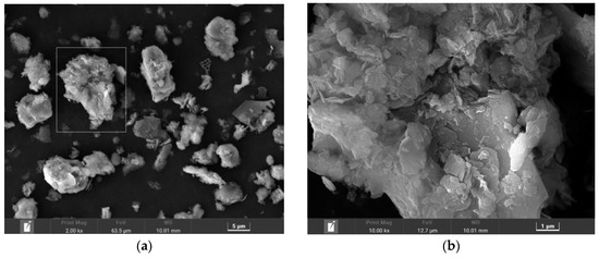 The measured values of physical and chemical parameters of SP are shown in Table 2 [30]. Most SP were classified as silt (2–20 μm), about 78.37%, with relatively fewer SP being classified as clay (<2 μm) and sand (>20 μm). SEM images of the SP samples are shown in Figure 1.