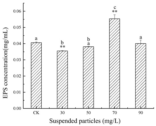 - SP in a particular concentration range (0–100 mg/L) had no significant effect on the EPS content of M. flos-aquae. When the particles exceeded a specific critical concentration (150 mg/L), the EPS secretion of M. flos-aquae was inhibited;