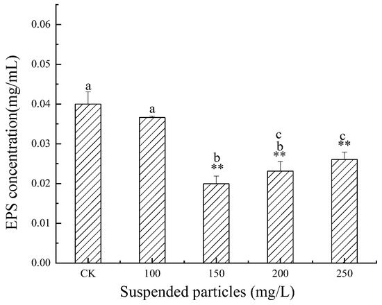 The effects of SP of different concentrations on the EPS content of M. flos-aquae in Jinjiang Estuary are shown in Figure 3. The EPS content of M. flos-aquae in the 150 mg/L particle concentration group was significantly lower than that in the 100 and 250 mg/L groups (p < 0.05). When the concentration of SP was 150 mg/L, the EPS content reached the minimum value (0.01992 mg/mL). There was no significant difference between the 200 and 250 mg/L particle concentration groups (p > 0.05). The EPS content in all experimental groups was lower than in the control group. There was no significant difference between the 100 mg/L group and control groups (p > 0.05). The other concentration groups were significantly lower than the control group (p < 0.01).