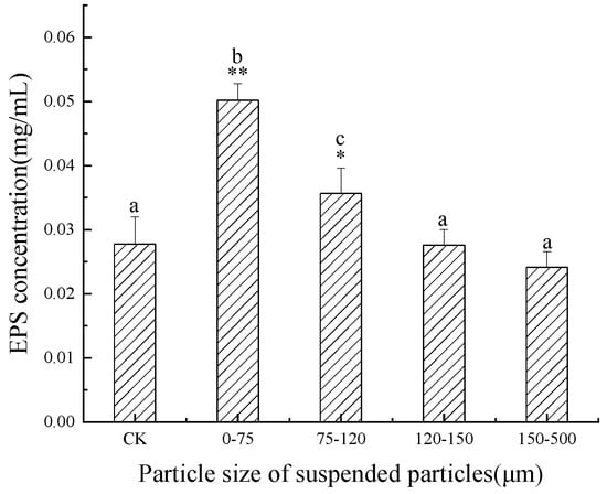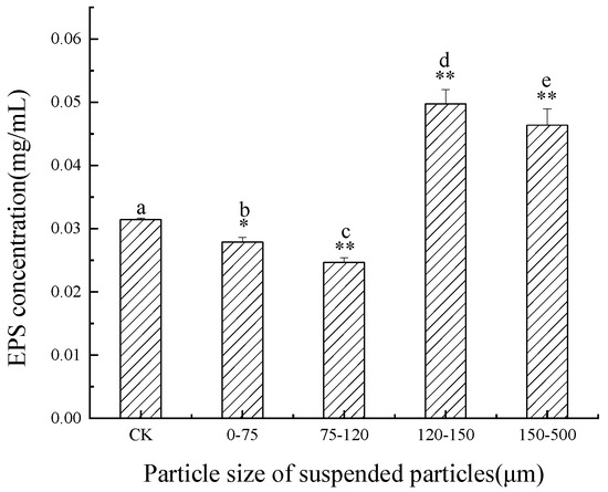Figure 4 shows the effects of SP of different particle sizes on the EPS content of C. pyrenoidosa in the Jinjiang Estuary. As can be seen in Figure 4, the EPS content of the 0–75 μm particle size of C. pyrenoidosa was significantly lower than that of the control group (p < 0.05), the content of EPS in the 75–120 μm particle size group was significantly lower than that in the control group (p < 0.01) and was the lowest overall (0.02467 mg/mL). The EPS content in the 120–150 and 150–500 μm particle size groups was significantly higher than that in the control group (p < 0.01), and the EPS content of the 120–150 μm group was the highest overall (0.04975 mg/mL) and 1.58 times that of the control group.