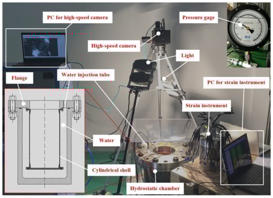 The external hydrostatic pressure test of the deep-sea shell structure was mostly carried out in a closed hydrostatic chamber. Thus, it was difficult to observe the buckling behavior and evolution characteristics. For this reason, a test platform suitable for real-time observation shell deformation under hydrostatic pressure was built. As shown in Figure 1, the test platform consisted of a hydrostatic chamber, a high-speed camera and a strain acquisition instrument. The composite cylindrical shell was connected to the flange to form a closed space with the hydrostatic chamber. The high-speed camera was set up above the chamber, and the strain gauges were pasted in the inner wall of the composite cylindrical shell and connected to the acquisition instrument through wires. A high-pressure water pump was used to continuously inject water into the hydrostatic chamber through the injection tube. Strain data and shell deformation graphic are simultaneously transmitted to the control computers, allowing the authors to monitor the buckling evolution of the composite cylindrical shell under hydrostatic pressure.