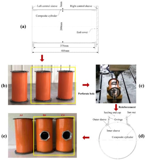 The composite cylinder was fabricated by the filament winding process with [±90]2/([±20]/[±90]/[±40]/[±90]/[±60]/[±90])2/[±90] sequence using the T700-12K Carbon fiber/Epoxy composite material, and the cylinder was formed on the core mold. After curing and demolding, it was cut into three cylinders with equal length 375 mm. As shown in Figure 2a, the left control sleeve and right control sleeve, made of aluminum alloy (Young modulus E = 71 GPa, Poisson’s ratio v = 0.33), were, respectively, nested on the two ends of each composite cylinder to support the shell. The end cover was attached to the right control sleeve. For a comparative study of the buckling behavior of perfect and perforated composite cylindrical shells, a hole with a diameter of 100 mm was cut in the two of the specimens (see Figure 2b,c). Design of reinforcement was carried out to compensate for the load-carrying capacity loss caused by the hole. Shown in Figure 2d, the reinforcement parts which were made of aluminum alloy consisted of an inner sleeve, an outer sleeve and a jam nut. The inner sleeve and the outer sleeve clamped the edge of the hole, and the jam nut produced a certain pre-tightening force so that the inner sleeve, the outer sleeve and the composite material cylinder were firmly connected. O-rings were used for sealing between inner sleeve and outer sleeve, and sealing between inner sleeve and end cap. The specimens ready for test were marked A#, B# and C# (see Figure 2e). The dimensions of composite cylindrical shell were as follows: the inner diameter 200 mm, length 405 mm and wall thickness 3 mm. The mechanical properties of T700-12K Carbon fiber/Epoxy are listed in Table 1.