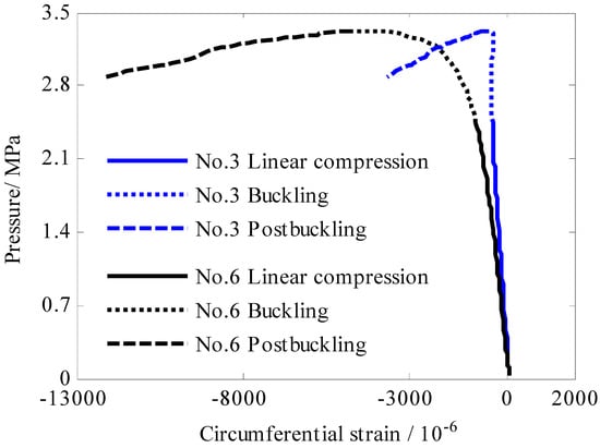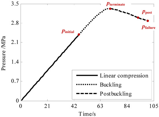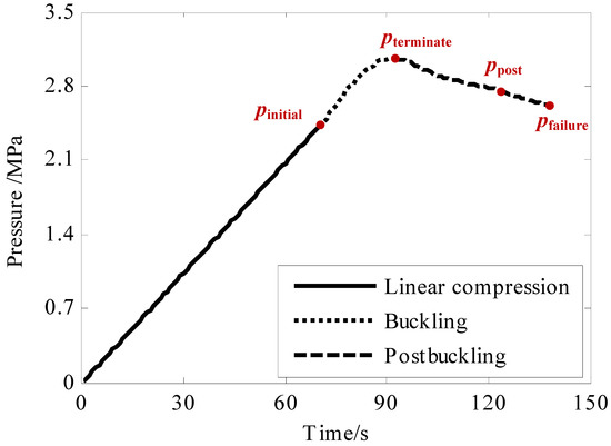Three composite cylindrical shells were tested in sequence, and the typical pressure vs. time curves were obtained. Figure 3 and Figure 4 show the evolution of the load-carrying capacity of the perfect composite cylindrical shell A# and the perforated composite cylindrical shell C#, respectively. The bearing capacity curves presented two characteristics: on the one hand, the curves could be divided into two sections, which are monotonically increasing section and monotonically decreasing section; on the other hand, the curves could also be divided into linear section and nonlinear section. According to the linearity, nonlinearity and monotonicity of the curve, the deformation of the composite cylindrical shell consisted of three stages: linear compression, buckling and post-buckling. The starting point of the nonlinear part was defined as initial buckling load pinitial, the extreme point and end point were defined as terminated buckling load pterminate and failure load pfailure, respectively.
