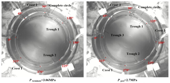 White silicone rubber was glued on the inner wall of the composite cylindrical shell, and a perfect circle was marked in the images captured by the high-speed camera to represent the outline of the undeformed shell. Comparing the white silicone rubber with the perfect circle, the deformation wave would be identified once the buckling behavior occurred. The deformation shape of the perfect composite cylindrical shell A# was shown in Figure 5. At the moment pterminate = 3.06 MPa, two crests and two troughs were clearly visible. Subsequently, the deformation developed into post-buckling stage where the initial buckling wave was extended widely (in case of ppost = 2.7 MPa), and the third trough and the third crest were created gradually. In the post-buckling stage the load carrying capacity decreased gradually. Eventually, the shell collapsed at pfailure= 2.58 MPa. At the moment of implosion, the cylindrical shell almost recovered its original shape except for a bulge at the blasting position (failure morphology shown in Table 3).