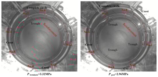 As for the perforated composite cylindrical shell C#, the deformation shape was shown in Figure 6. At the moment pterminate = 3.32 MPa, the buckling wave was faintly visible locally. In the post-buckling stage (in case of ppost = 2.96 MPa), the deformation shape had a relatively large expansion. In the reinforcement part, the width of wave crest was much larger. This phenomenon was caused by the increased stiffness of the reinforcement part. Ultimately, the perforated composite cylindrical shells B# and C# imploded at pfailure = 2.64 MPa and pfailure = 2.88 MPa, respectively. Each of the shell created an axial crack which located by the side of the reinforcement part (shown in Table 3).