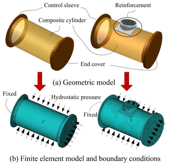 The finite element analysis was carried out to predict the buckling pressure and buckling mode of composite cylindrical shell subjected to hydrostatic pressure. Both static and eigenvalue analysis were conducted in sequence. Figure 7 shows the geometric model and finite element model of the composite cylindrical shell. The composite cylinder was meshed using a three-dimensional structural shell element (SHELL 281), which is defined by eight nodes with six degrees of freedom at each node: translations in the x-, y- and z-axes, and rotations about the x-, y- and z-axes. The control sleeves, reinforcement part and end cover were meshed using a three-dimensional tetrahedral structural solid element (SOLID187), which has a quadratic displacement behavior and is well suited to modeling irregular meshes. The element is defined by ten nodes having three degrees of freedom at each node: translations in the x-, y- and z-axes. The contact elements TARGE170 and CONTA174 were used to bond the composite cylinder with control sleeve and reinforcement part together. As for the boundary conditions, the left control sleeve was fixed, and the circumference and the axis direction of composite cylindrical shell met the actual experimental condition. Both axial pressure and external pressure were applied on the surface of the shell (see Figure 7b).
