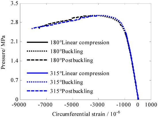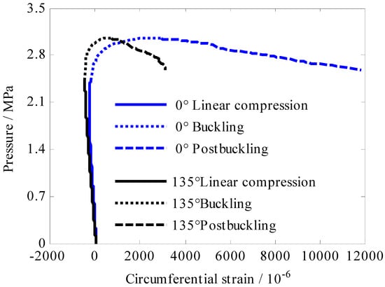 Circumferential strain gauges (eight gages for perfect cylinder and seven gages for perforated cylinder) were glued on the inner wall of the composite cylindrical shell at the mid-length, and they distributed uniformly every 45° in circumferential direction. In the following strain response analysis, these strain gauges were classified into three groups based on their position such as the crest, trough and boundary sections on the buckling wave (see Table 5). Strain responses of the perfect cylinder A# and perforated cylinder C# are shown in Figure 8, Figure 9 and Figure 10 and Figure 11, Figure 12 and Figure 13 respectively. All these strain response curves consisted of three segments which represented the linear compression, buckling and post-buckling deformation stages, respectively. As for the perfect cylinder A#, in the linear compression stage 0–2.42 MPa, the trends in the three group of strain response were extremely similar. Circumferential strain presented compressive and increased linearly with the hydrostatic pressure. In buckling stage 2.42–3.06 MPa, strain magnitude tended to be nonlinearly varying with load. In this process, it was interesting that strain magnitude of the measuring points (0° and 135°) located at the trough of buckling wave gradually changed from negative to positive (see Figure 9). This phenomenon was called strain reversal which was caused by large radial displacement towards the axis of the composite cylinder according to the deformation shape shown in Figure 5. In the post-buckling stage 3.06–2.58 MPa, the load carrying capacity of the composite cylindrical shell gradually decreased while the deformation of the shell became more apparent shown in Figure 5. Therefore, it is easy to explain that the magnitude of positive strain at the trough (in Figure 9) and compression strain at the crest (in Figure 8) continued to increase in postbuckling stage. Observe strain response at the boundary of crest and trough of the perfect cylinder A#. It is strange that strain gages located at 45° and 270° presented compression in the whole load history while Strain gages located at 225° and 90° exhibited reversal phenomenon in the buckling stage.
