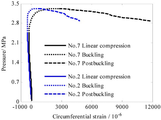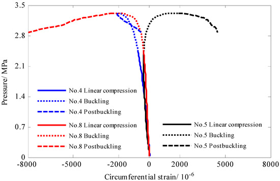 As for the perforated cylinder C#, in the linear compression stage 0–2.44 MPa circumferential strain presented linearly compressive and increased linearly with the hydrostatic pressure. In buckling stage 2.44–3.32 MPa, strain magnitude tended to be nonlinearly varying with hydrostatic pressure. Additionally, two phenomena, which also manifested on the perfect cylinder A#, occurred. On the one hand, circumferential strain of the measuring points No.3 and No.6 located at the crest (see Figure 11) of the buckling wave showed compressive in the buckling stage. On the other hand, strain reversal of No.2 and No.7 also occurred at the trough (Figure 12) in this stage. At the boundary of crest and trough of the buckling wave (see Figure 13), strain gage No.8 presented compressive strain in load history, and strain gage No.5 exhibited reversal phenomenon in the buckling stage. With regard to No.4, the magnitude of compressive strain decreases sharply when the deformation developed into postbuckling stage, which might be cause by material damage at this location. Focus on the influence of reinforcement part on the strain response of the perforated composite cylindrical shell. We review strain response of No.2 (see Figure 12) and No.8 (see Figure 13) located in the reinforcement boundary area. Strain magnitude of these two points was in good agreement with other measuring points in linear compression stage. This phenomenon indicated that the reinforcement design could ensure the continuity of the hoop stiffness which also can be verified by the fact that both the terminated buckling load pterminate and the final failure load pfailure of the perforated shell B# and C# were higher than that of perfect shell A#.