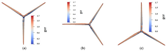 As shown in Figure 11a, since blades A and B are approximately symmetrical structures, the distribution of the rain’s final velocity is basically consistent. When α = 0°, blade C is at the lowest position, and the rain’s final velocity UZ is relatively small, resulting in parameter β being greater than 1. In Figure 11c, blades A and C are approximately symmetrical structures.