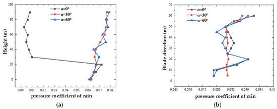 The rain’s final velocity UX increases gradually along the radial direction because the closer the rain is to the tip of blades, the more obvious the phenomenon of windblown rain becomes. For the rain’s final velocity UZ, because the rain is mainly injected at the top, the velocity component also shows a decreasing trend from bottom to top, and the velocity at the root of each blade is basically consistent.