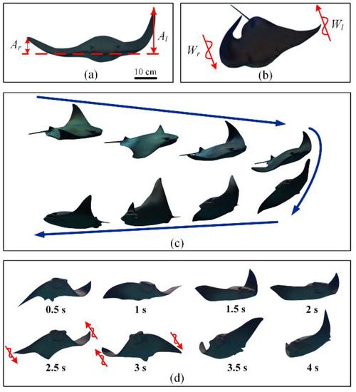 Turning performance is an important aspect of an aquatic animal’s locomotor skills, including mobility (turning ability in a confined space) and agility (turning angular velocity). It plays an important role in capturing objects, fleeing predators, avoiding obstacles in complex environments and resisting environmental interference [11,12,13,14,15]. Because there are many underwater disturbances, the completion of an underwater task depends more on mobility than speed [16,17]. Turning performance has always been the focus of most mobility research, especially yaw turning [18]. Because of its two broad pectoral fins, manta rays show better stability under interference [15]. In addition, manta rays have high turning performance, with a turning radius of 0.38 times their body length and a yaw angle velocity of 67.32°/s [19]. In recent years, manta rays have attracted increasing attention from researchers [20,21,22,23,24].