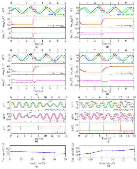 Simulation analysis of the transition characteristics between two oscillator simulations and open-loop experiments of two yaw modes. The red straight dashed line corresponds to the parameter change time, and the red circle is the output transition process. (a) Simulation analysis of the transition equation without the expected phase difference ( = 0.5, = 6, = 30); an obvious wave crest appears in the output. (b) The expected phase difference transition equation is introduced for simulation analysis ( = 0.5, = 6, = 30), and the output peak is weakened. (c) In the simulation analysis reducing the coupling coefficient ( = 0.5, = 3, = 30), the output peak disappears, but the smoothness is poor. (d) The simulation analysis reducing the transition coefficient ( = 0.5, = 6, = 10) shows that the output smoothness is good. (e) Simulation of the yaw mode based on asymmetric amplitude. (f) Simulation of the yaw mode based on asymmetric phase difference. (g) Open-loop experiments based on asymmetric amplitude yaw mode. (h) Open-loop experiments of yaw mode based on asymmetric phase difference.