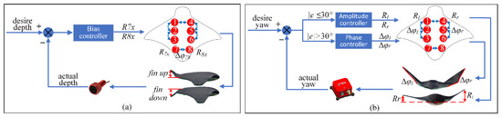 Closed-loop control logic diagram of the robot. (a) In the closed-loop control of the robot’s depth determination, the up and down deflection of the tail fin is adjusted according to the real-time depth of the depth sensor, and the robot is adjusted to the set depth. (b) The robot’s fixed course closed-loop control adjusts the amplitude of the pectoral fins when the course deviation is less than 30° and adjusts the phase difference of the pectoral fins when the course deviation is greater than 30°.
