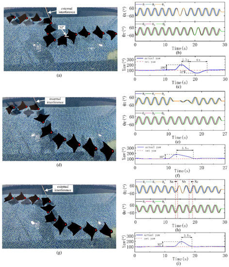 In the normal forward swimming state, we try to move the robot’s head clockwise in front of the swimming direction using a PVC pipe to make it deviate from the original course by approximately 90°. Due to the uncertainty of human interference, it is difficult to ensure that the interference intensity is completely consistent each time, but the interference is at the same intensity level. We performed interference experiments relying only on the phase difference or amplitude difference and relying on the combined mode of the phase and amplitude difference. The robot starts to have a set yaw and always swims according to the set value, and the actual yaw is the real-time yaw when the robot swims.