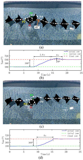 We try to make the robot turn 360° to the right under the normal forward swimming mode and then restore the forward swimming mode. The frame pictures labeled P1, P2, P3 and P4 in Figure 6a, c are the typical pose diagrams of the robot turning 90°, 180°, 270°, 360°. For convenience, when the robot turns right, its course angle continues to accumulate. After turning right for one cycle, the course angle increases 360°. Relying only on the phase difference to adjust the course, it takes 5.8 s to turn for one cycle, and the yaw angle rate is 62°/s. As in the course interference experiment, there will be an overshoot of approximately 40° after one cycle of turning and a final readjustment to the starting course. The adjustment time of the whole process is 9.8 s (Figure 6b). It takes 6s to turn 360° to the right by relying on the combined mode, and the yaw angle rate is 60°/s. Compared with the phase difference mode, the yaw angle rate is hardly reduced and will not produce an overshoot. The robot can stably return to the initial course, and the adjustment time in the whole process is reduced (Figure 6d). Experiments show that the combined mode has almost the same rapidity and no overshoot compared with the phase difference mode.