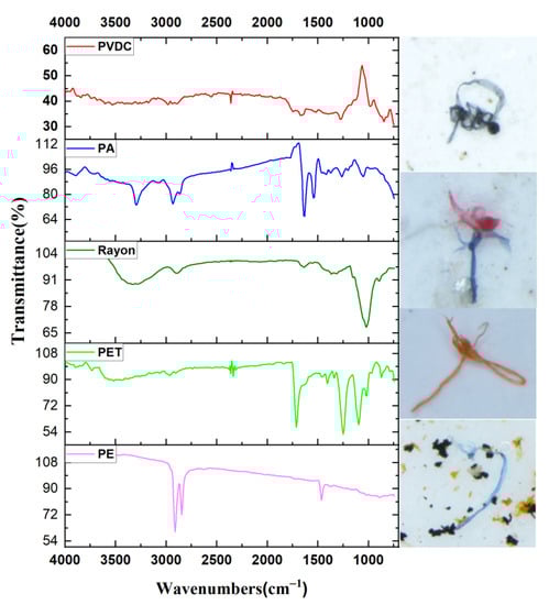 The suspected microplastic particles or fragments were observed by Stereo Microscope (Nikon SMZ1270) (magnification: 20–80). The characteristic information of microplastics was recorded in detail, such as shape, and size [37]. The microplastic shape was cataloged as fiber, fragment, granule, or foam. The size of microplastics was divided into four fractions of <0.5 mm, 0.5–1.0 mm, 1.0–3.0 mm, and 3.0–5.0 mm, respectively. Photos of assumed microplastics were taken by the DS RI2 camera system (Figure 1). The compositions of the suspected microplastics were identified by a Fourier Transform Infrared Spectroscope (micro-FTIR, PerkinElmer Spotlight 400, Llantrisant, UK) to determine the types of the polymers. The spectra were acquired from a spectral resolution of 8 cm−1 with co-scan 16 times, and the spectral range was set from 4000 cm−1 to 675 cm−1. The collection time was 3 s with transmission mode. The size of the diaphragm depended on the size of the microplastics in the sample. The obtained spectra of microplastics were compared with the standard spectra in the spectra library of OMNIC PICTA software to determine the composition of polymers. In this study, the matching degree between the spectra of microplastic samples and the standard spectra from the Saddler database in OMNIC PICTA software was higher than 80%. The minimum particle size of microplastics that we could detect by this method was 20 µm.