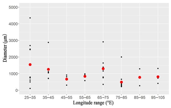 Particle size distribution characteristics of microplastics. (Red dot “·” is the average size of all microplastics. Black dot “·” is the size of each microplastics).