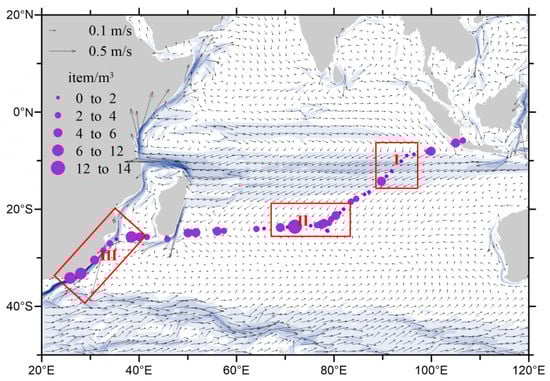 An in-depth study of the transfer process and influencing factors of microplastics in the marine environment is conducive to accurately judging the convergence and fate of microplastics in the ocean. Microplastics have floatability and move with ocean currents. The transfer or diffusion of microplastics in the ocean is greatly affected by the flow direction of ocean currents. Previous studies showed that ocean currents could affect the spatial distribution of microplastics in seawater [57]. The sea surface rotation at low latitudes may have an effect on the abundance distribution of microplastics in the southern Indian Ocean [58]. In the study of the distribution of microplastics in the north Atlantic subtropical circulation region, Brach et al. [59] found that the mesoscale eddies had agglomeration and transport effects on microplastics, and the abundance of microplastics in the anticyclonic vortex region was 9.4 times higher than that in the cyclonic vortex region. Both currents were relatively strong in this studied area, with south Equatorial Current to the north and westerly drift to the south(blue in Figure 7). Weak upper circulation and convergence were found in the central area of the studied area. Figure 7 shows the correlation between the abundance distribution of microplastics and the upper layer ocean circulation. We found that the Indian Ocean layer ocean circulation had an obvious effect on the spatial distribution of microplastics, as follows: