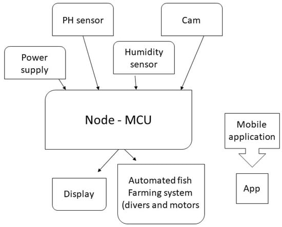 In addition, aquaculture ponds may be considered very special marine environments, and they need continuous monitoring and real-time reactions to negative changes impacting the organisms contained therein []. In addition, in this case, artificial intelligence and IoT devices may be applied to improve production efficiency and reduce impacts and risks. In fact, the connection between good environmental conditions and seafood health in aquaculture has been documented [,,]. Sea cages can be more than 45 m in diameter and 30 m deep, and they need frequent inspections. Although a single cage can contain high value production [,], the level of surveillance of the product and of the closer environments is often low []. As for tank aquaculture, various remote sensor systems were proposed to have a conveyed gathering of sensor hubs organized together and be able to exchange the crude information up to a base station through an IoT network [,]. Using Arduino-like hardware and a few simple probes, automatic farming systems were developed based on IoT platforms (Figure 7).