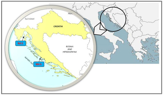 Sampling locations: NAS—marine fish farm in the north Adriatic and MAS—marine fish farm in the middle Adriatic.