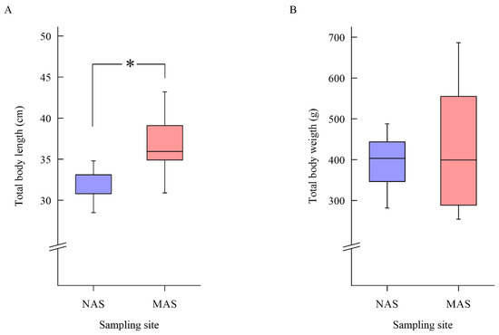 (A) The total body length (cm) and (B) the total body weight (g) of sea bass (N = 10) from sites NAS (■) and MAS (■). Square boxes indicate the lower and upper quartiles and the whiskers represent the minimum and maximum data values (1.5 interquartile range). The medians are depicted by a solid line. * Significant difference (p < 0.05) between the sites.