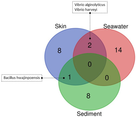 Venn diagram of the bacterial species that were identified in culturable microbiota of fish skin, seawater, and sediment associated with marine fish farm MAS.