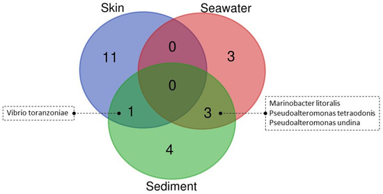 At the MAS farm, 20 isolates out of 64 in total were isolated from the European seabass swabs, while 22 accounted for seawater and sediment isolates. A total of 22 bacterial species were identified among the isolates from all the sample types in the MAS farm (Table 5). Despite the difference of species number (Table 5) among the bacterial communities of the fish skin (11 species), seawater (3 species), and sediment (4 species), species Marinobacter litoralis, and two species from the genus Pseudoalteromonas (Pseudoalteromonas tetraodonis, Pseudoalteromonas undina) were detected in the seawater and sediment, whereas V. toranozoniae was identified in the skin and sediment (Figure 4).