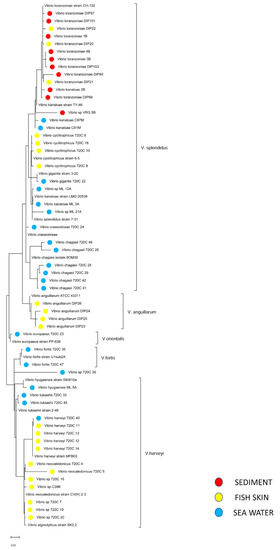 - Franco, A.; Rückert, C.; Blom, J.; Busche, T.; Reichert, J.; Schubert, P.; Goesmann, A.; Kalinowski, J.; Wilke, T.; Kämpfer, P.; et al. High diversity of Vibrio spp. associated with different ecological niches in a marine aquaria system and description of Vibrio aquimaris sp. nov. Syst. Appl. Microbiol. 2020, 43, 126123. [Google Scholar] [CrossRef] [PubMed]