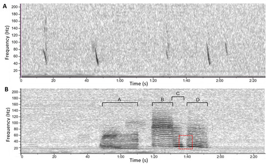 Spectrogram of a series of high-quality D calls (A) and a SEP2 call (B) from this study. SEP call units are marked by A, B, C, D. The red box indicates the portion of the call with higher SNR used to detect fainter calls (see Section 2.1 in the Materials and Methods). Spectrogram parameters: 200 Hz frequency axis, DFT = 2048 samples, FFT = 750, 10% overlap and Hann window function. Spectrograms produced with Raven Pro 1.6.